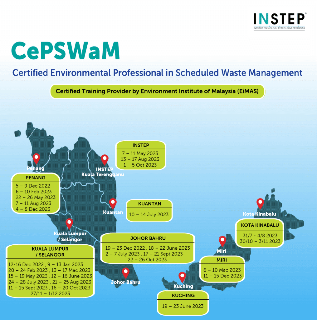 Safe handling and proper management of hazardous wastes require competent person who is knowledgeable and able to advise organisation to comply with the legal requirements and industry best practices. INSTEP is an approved training provider to facilitate CePSWaM with the intention to produce as many competent person as possible for the benefit of the nation. Our trainers are capable to share their hands-on experiences and transfer their knowledge, in addition to classroom activities and discussion of case studies.